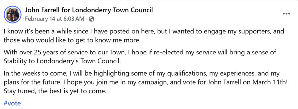 John Farrell for Londonderry Town Council Posted on 02/24/202502/24/2025 By TownUnderground Incumbent Candidate for Town Council has a candidate Facebook page located HERE Uncategorized