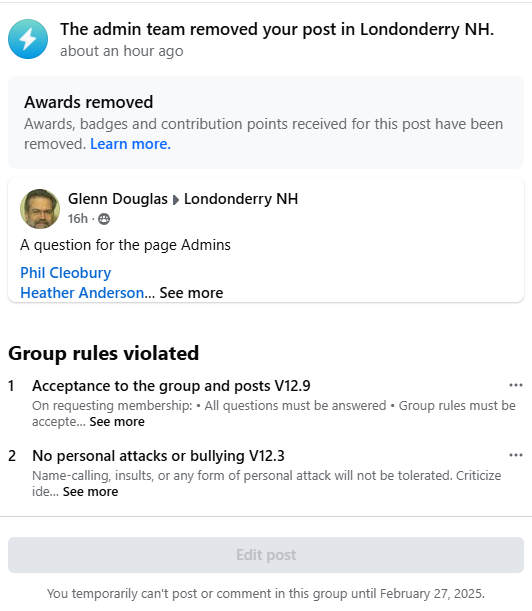 I was made aware of two posts that were removed claiming they violated the page rules. I posted a question to the Admins of ‘Londonderry NH’ and asked if candidates are no longer allowed to post information. My question was met with a swift response