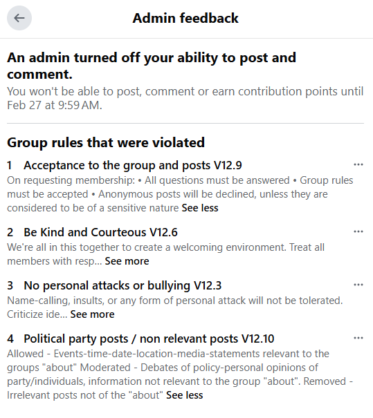 The Admins did not respond and answer, instead they removed the post, accused me of violating the rules, and banned me from the page for 24 hours.