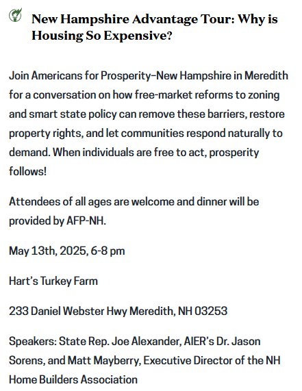 Join Americans for Prosperity–New Hampshire in Meredith for a conversation on how free-market reforms to zoning and smart state policy can remove these barriers, restore property rights, and let communities respond naturally to demand. When individuals are free to act, prosperity follows!