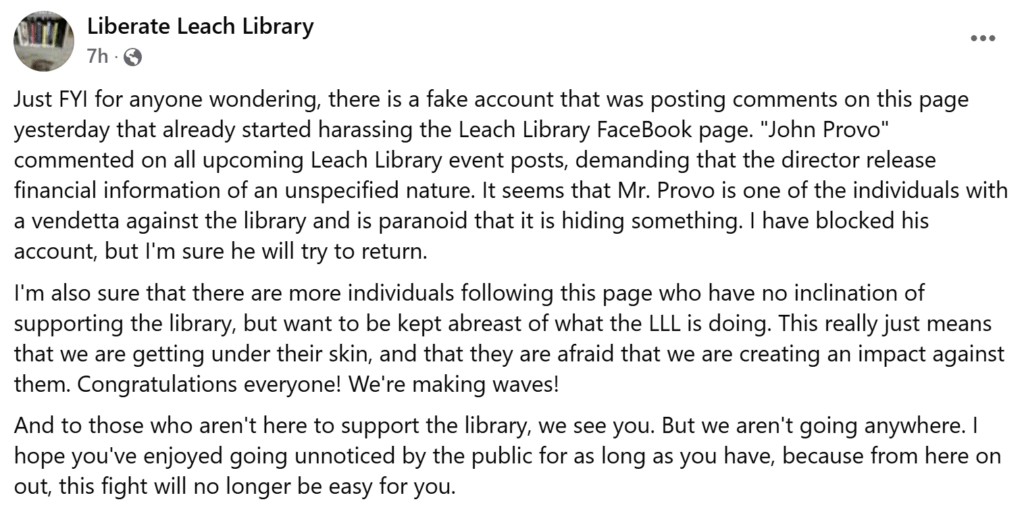 Just FYI for anyone wondering, there is a fake account that was posting comments on this page yesterday that already started harassing the Leach Library FaceBook page. “John Provo” commented on all upcoming Leach Library event posts, demanding that the director release financial information of an unspecified nature. It seems that Mr. Provo is one of the individuals with a vendetta against the library and is paranoid that it is hiding something. I have blocked his account, but I’m sure he will try to return.