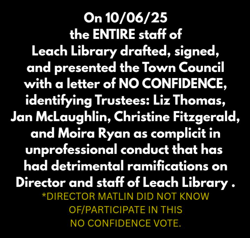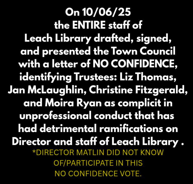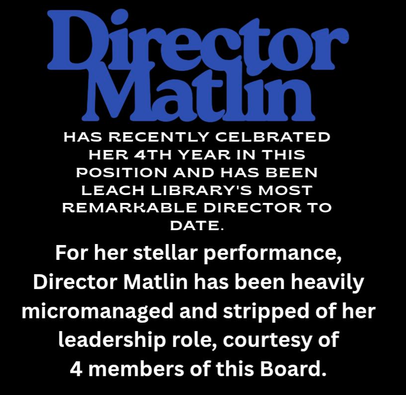 As an elected member of the Board, I represent you, the taxpayer and patron. I was elected to be an ally and advocate for Leach Library and its mission to “provide materials, information, and services for community residents of all ages to meet their personal, professional, and recreational needs.” We are running out of time to insulate Leach from deliberate underfunding, mismanagement, and a hostile work environment for our library staff. It is important for you to understand the depth of dysregulation that is occurring and the lasting effects that it will have at Leach Library.