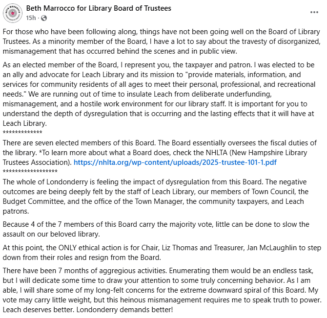 The whole of Londonderry is feeling the impact of dysregulation from this Board. The negative outcomes are being deeply felt by the staff of Leach Library, our members of Town Council, the Budget Committee, and the office of the Town Manager, the community taxpayers, and Leach patrons.