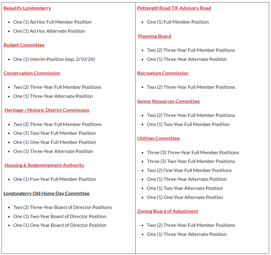 The Town of Londonderry is seeking volunteers to serve on the following Boards: