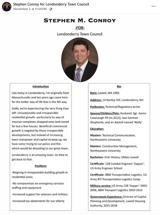 The filing perion to run for elected office is not until January, but one candidate has begun his campaign early. Stephen Conroy is running for Town Council he will be challenging incumbent Councilors Ron Dunn and Ted Combes, should they decide to run for reelection. Conroy has a Facebook pager located HERE