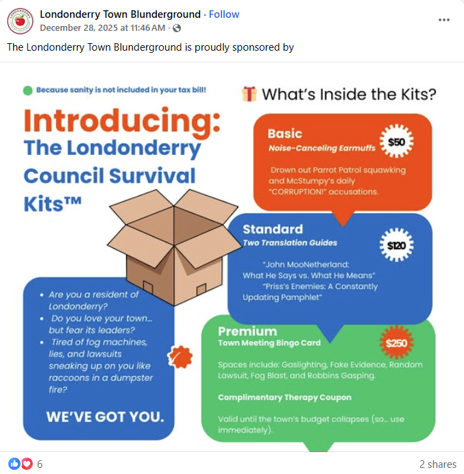There is a new Londonderry Facebook page in town as of November. The Londonderry Town Blunderground a ‘satire/parody’ site run by an anonymous individual. The page has 68 followers including Sherry Farrell, Londonderry Town Clerk, John Farrell for Londonderry Town Council, Londonderry NH Democrats, and the now defunct Londonderry News which was run by former Town Treasure Kathy Wagner. The page was followed by the official Facebook page of the Town of Londonderry, New Hampshire for several weeks.
