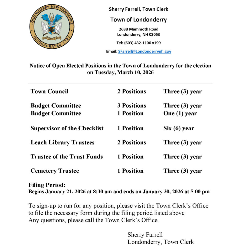 Notice of Open Elected Positions in the Town of Londonderry for the election on Tuesday, March 10, 2026. Current office holders are listed below.