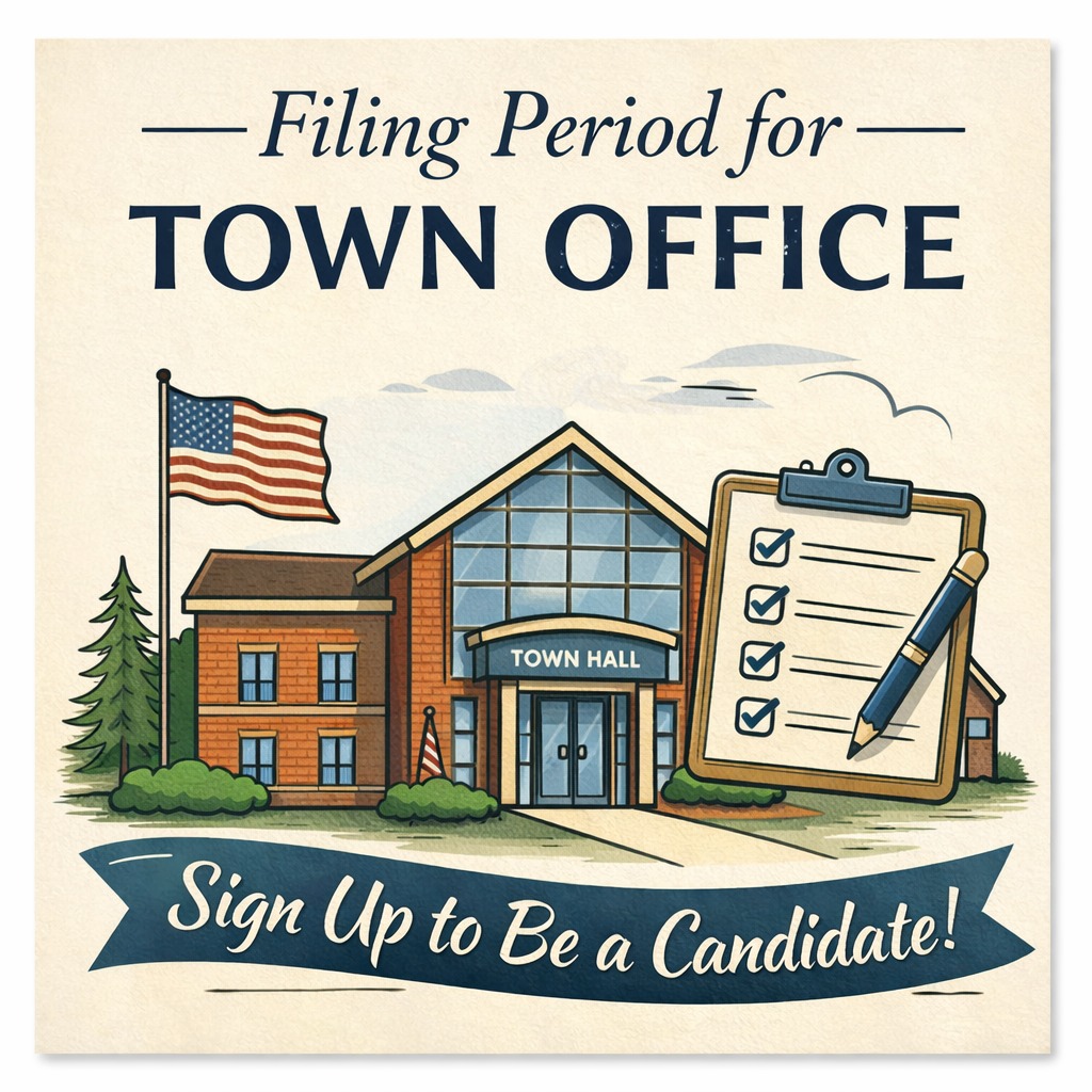 Filing Period: Begins January 21, 2026 at 8:30 a.m. and ends on January 30, 2026 at 5:00 p.m. To sign up to run for any position, please visit the Town Clerk’s Office to file the necessary form during the filing period listed above.