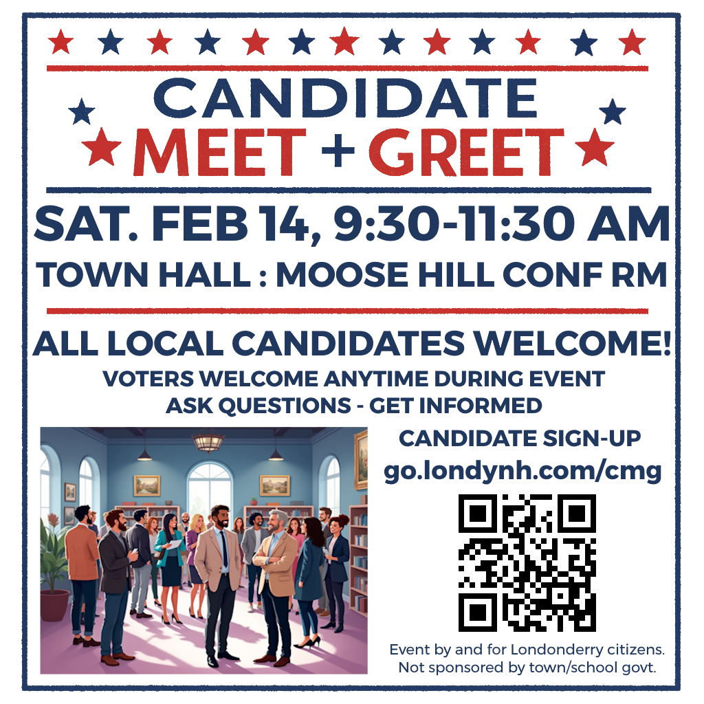 All town and school candidates who will be on the March ballot are welcome. Candidates wishing to be there are asked to register for logistics. Voters can drop by anytime and do not need to register in advance.