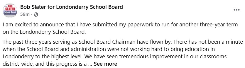 School Board Chairman Bob Slater announced he will be seeking reelection on his Bob Slater for Londonderry School Board Facebook page