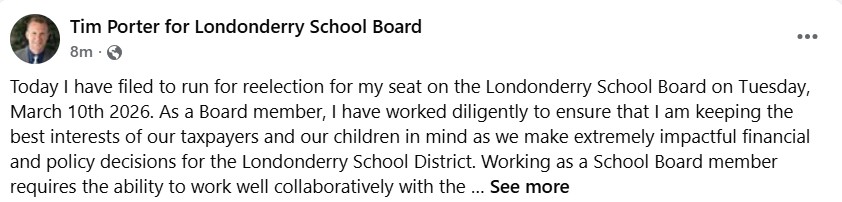 School Board member Tim Porter announced he will be seeking reelection on his Tim Porter for Londonderry School Board Facebook page