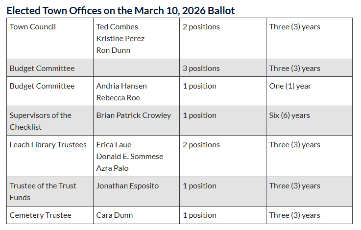 The filing period for the March 2026 Town and School elections will run from 8:30 a.m. on Wednesday, January 21, 2026 to 5:00 p.m. on Friday, January 30, 2026.