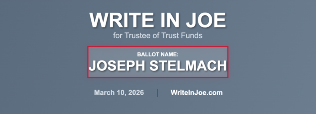 – Write in JOSEPH STELMACH on your ballot under Trustee of Trust Funds