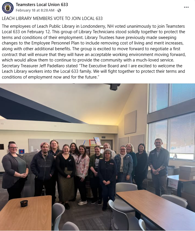 The employees of Leach Public Library in Londonderry, NH voted unanimously to join Teamsters Local 633 on February 12. This group of Library Technicians stood solidly together to protect the terms and conditions of their employment. Library Trustees have previously made sweeping changes to the Employee Personnel Plan to include removing cost of living and merit increases, along with other additional benefits. The group is excited to move forward to negotiate a first contract that will ensure that they will have an acceptable working environment moving forward, which would allow them to continue to provide the community with a much-loved service. Secretary Treasurer Jeff Padellaro stated “The Executive Board and I are excited to welcome the Leach Library workers into the Local 633 family. We will fight together to protect their terms and conditions of employment now and for the future.”