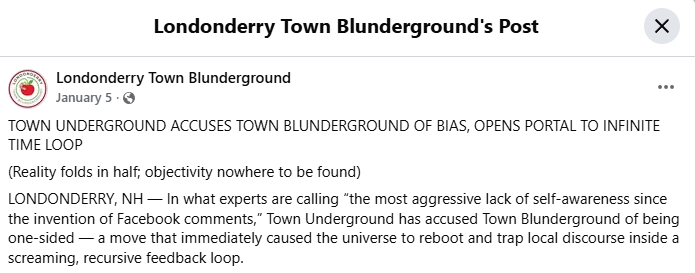 LONDONDERRY, NH — In what experts are calling “the most aggressive lack of self-awareness since the invention of Facebook comments,” Town Underground has accused Town Blunderground of being one-sided — a move that immediately caused the universe to reboot and trap local discourse inside a screaming, recursive feedback loop.