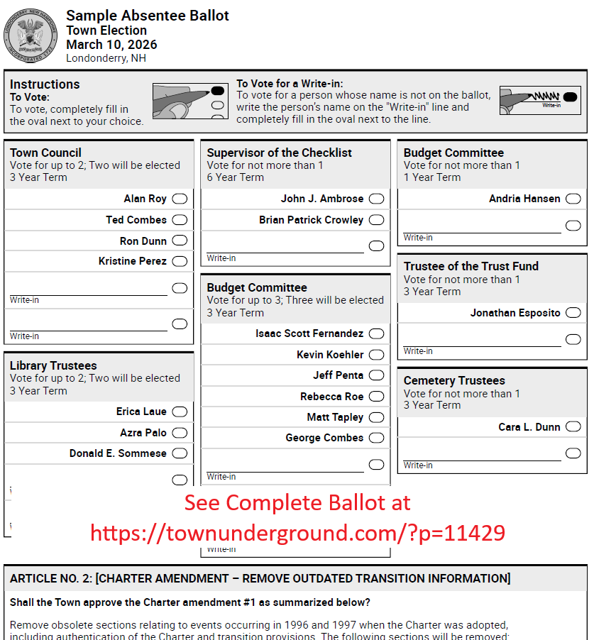 Town of Londonderry Sample Ballot for 3/10/2026 Election Posted on 02/28/202602/28/2026 By TownUnderground See attached PDF for the 3/10/2025 Town of Londonderry Sample Ballot. See complete ballot HERE 2026_03-10-2026_Town Sample BallotDownload Uncategorized