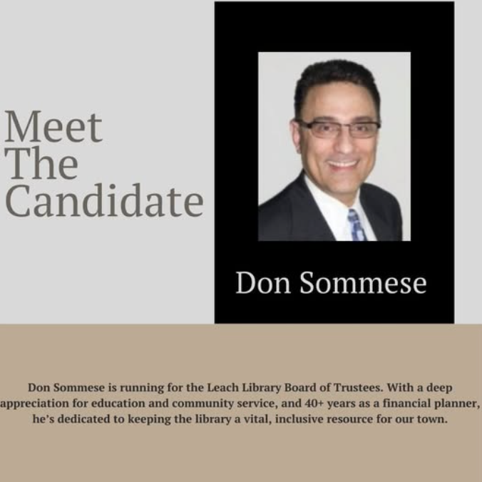 Don Sommese for Leach Library Board of Trustees Facebook Page Posted on 03/04/202603/04/2026 By TownUnderground Candidate for Library Trustee Don Sommese Facebook page can be found HERE Uncategorized