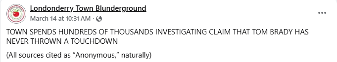 Today’s Blunderground ‘satire/parody’ is in reference to last nights Planning Board Public Hearing – Planned Unit Development, 3/23/2026 . As per usual the site attacks it’s favorite individuals; Town Underground, Town Councilor Karen McStumpy, and State Rep. Priscilla. See Londonderry Town Blunderground for details on who appears to be who.