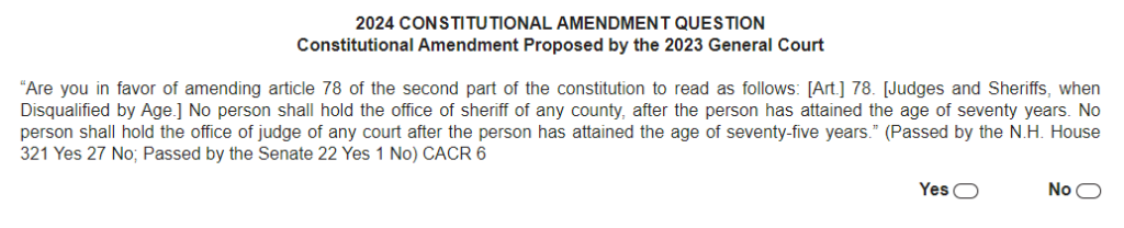 “Are you in favor of amending article 78 of the second part of the constitution to read as follows: [Art.] 78. [Judges and Sheriffs, when Disqualified by Age.] No person shall hold the office of sheriff of any county, after the person has attained the age of seventy years. No person shall hold the office of judge of any court after the person has attained the age of seventy-five years.” (Passed by the N.H. House 321 Yes 27 No; Passed by the Senate 22 Yes 1 No) CACR 6