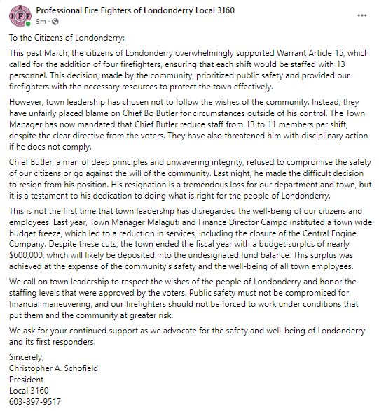 The Professional Fire Fighters of Londonderry Local 3160 responded to Fire Chief Butlers resignation in a Facebook post HERE