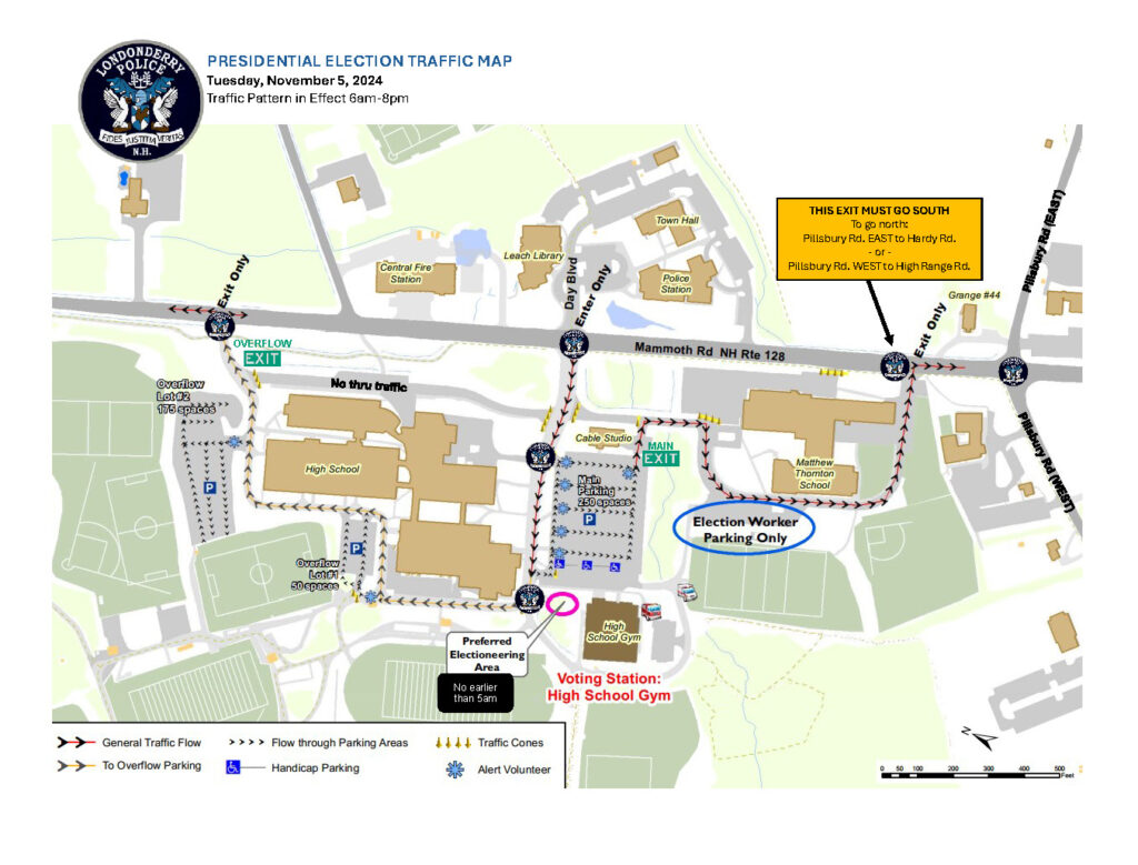 Please see the below parking map for the upcoming General Election on Tuesday, November 5, 2024. Please note the overflow lots and the different traffic pattern for the day. Londonderry ALERT will be operating a golf cart shuttle to the overflow lots from the gymnasium for those with mobility challenges.