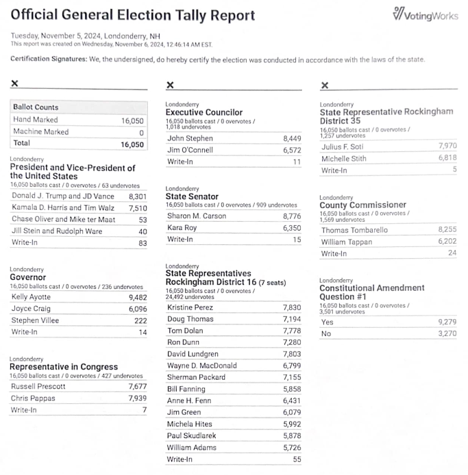 Please see Londonderry Election Results UPDATED, 11/6/2024 released by Town Hall