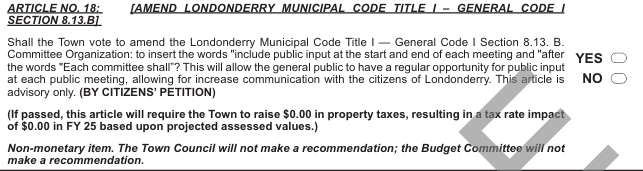 Article 18 which passed on 3/12/2024 with a vote of 3,085 for and 1,077 against the article. Article 18 would added public comment to the beginning and end all public meetings in Town.