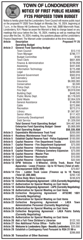 occur after the Dec. 16, 2024, meeting. Any questions please call the Londonderry
